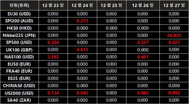 아래의 지수CFD 상품 배당금은 향후 일정에 따라 조정될 예정입니다. 지수CFD에 대한 상세내용은 배당금 지급일 전날 마감 후, 잔액 부분에 “Div &<거래상품명>&<순 거래량>”형식으로 표시됩니다.