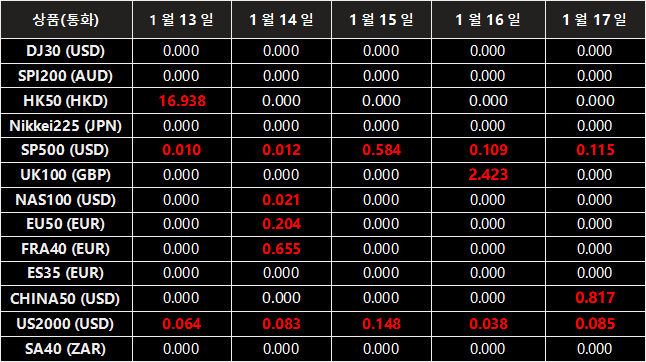 아래의 지수CFD 상품 배당금은 향후 일정에 따라 조정될 예정입니다. 지수CFD에 대한 상세내용은 배당금 지급일 전날 마감 후, 잔액 부분에 “Div &<거래상품명>&<순 거래량>”형식으로 표시됩니다.