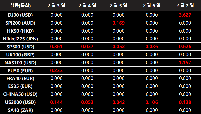 아래의 지수CFD 상품 배당금은 향후 일정에 따라 조정될 예정입니다. 지수CFD에 대한 상세내용은 배당금 지급일 전날 마감 후, 잔액 부분에 “Div &<거래상품명>&<순 거래량>”형식으로 표시됩니다.