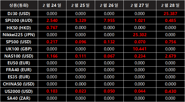 아래의 지수CFD 상품 배당금은 향후 일정에 따라 조정될 예정입니다. 지수CFD에 대한 상세내용은 배당금 지급일 전날 마감 후, 잔액 부분에 “Div &<거래상품명>&<순 거래량>”형식으로 표시됩니다.