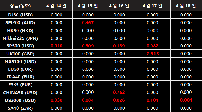 아래의 지수CFD 상품 배당금은 향후 일정에 따라 조정될 예정입니다. 지수CFD에 대한 상세내용은 배당금 지급일 전날 마감 후, 잔액 부분에 “Div &<거래상품명>&<순 거래량>”형식으로 표시됩니다.