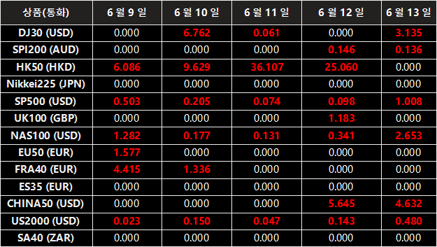 아래의 지수CFD 상품 배당금은 향후 일정에 따라 조정될 예정입니다. 지수CFD에 대한 상세내용은 배당금 지급일 전날 마감 후, 잔액 부분에 “Div &<거래상품명>&<순 거래량>”형식으로 표시됩니다.